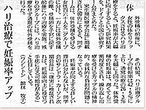 米生殖医療学会誌に掲載された報告によると、同チームは、体外受精を受ける女性百六十人を二グループに分け、一方には体外受精の際、受精卵を子宮に戻す前後にハリ治療を実施。残りのグループには、ハリ治療をせず通常の体外受精を行った。